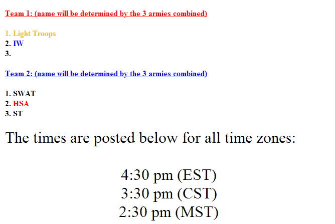 Tomorrow/Today (whenever you are reading this) We have decided to participate in the war on Club Warfare. Everyone needs to register to participate since this isn’t regular CP. There also may be some bad language so if you are one of the younger members in IW you might not want to participate. You can register at: http://register.clubwarfare.me/ (I would advise you to use a made up email so that the devs don’t get your real one, for privacy issues) The times and teams for the battle is below: