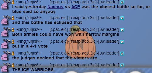 Today we had our big battle vs RPF in the knock-out rounds of the champions cup…… AND WE WON! I am very pleased with everyone’s performance who came. We had about 25 in the main battle room throughout the battle and more that were locked out. We also had around 40 people on chat which is pretty good. To celebrate we can have a party on cp this week. When the depends on the situation of the war & when I can come & such & such. There are a lot of pictures so brace yourselves.