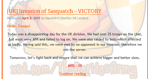 The Doritos are a small and weak army. They are jokes. They multilog and cheat everyday. We are currently winning the war, We are undefeated and crushing the evil Doritos. Soon the Doritos will have no servers and will be forced to die.