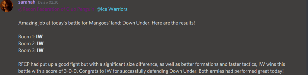 Our last defence for Mangoes ended with our opponents’ – Recon Federation of Club Penguin – defeat. Maxing 70 penguins and using incredibile fast phrase-tactics brought us victory. A huge thank you to everyone who contributed to this success. Don’t freeze up guys!