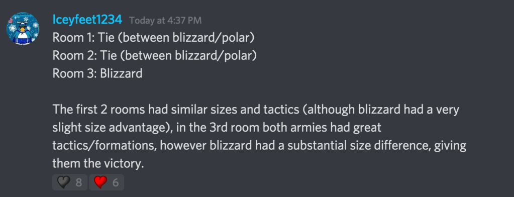 Today we logged onto Summit where we held our first Divisional Practice Battle with our re-vamped divisions! This was a 3-way battle with the Polar Division, Blizzard Division, and the Templars!