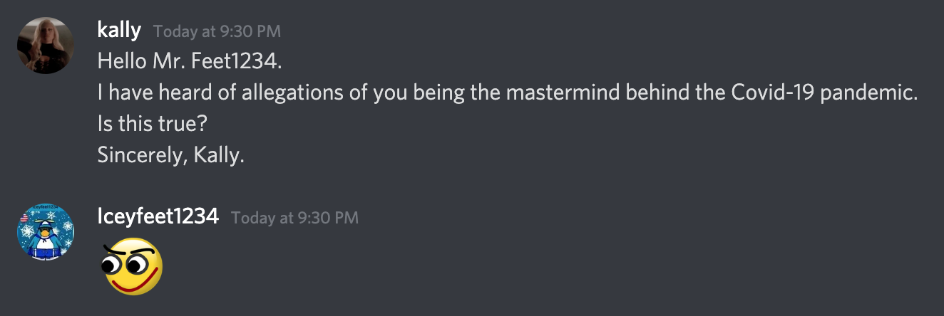 There have been allegations of Iceyfeet1234 being the mastermind behind the Covid-19 pandemic. Is this true?