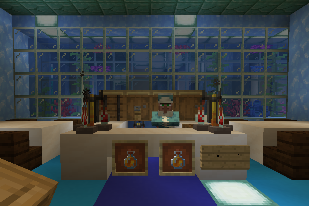 The main build of our spawn zone is the castle! Put together by all our mods. There are too many rooms to show pictures of but we do have a couple of inside looks. Some of the rooms are, Regan’s pub, the throne room, the kitchen, Polar & Blizzard towers, our Subdivision meeting rooms, staff rooms and so much more! The basement is a total maze, but down there you can find staff rooms, the SIT school, mod housing, our movie theatre, Alex’s pool and much more! Its a really cool place to explore and play hide and seek in!!