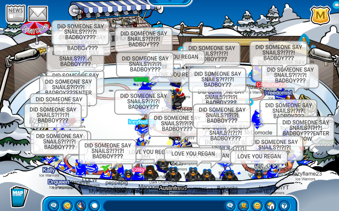 For our last event in November, we logged on for a food fight, where everybody changed into their favourite food costume! It was a bunch of fun and we even held a snowball fight (Law vs Iceyfeet) in the Pizza Parlor!