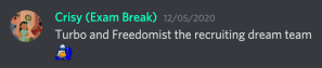 This week’s staff members are the recruiting power duo, Freedomist and Turbo! Turbo only rejoined the Ice Warriors 1.5 weeks ago, but quickly found his way back to staff and hasn’t stopped being amazing us ever since! His recruiting buddy Freedomist, as always has done an excellent job as staff, and keeps surprising us, every single week. The power duo thus really deserves this honour, we couldn’t even pick between the two! Congratulations to Turbo and a massive shoutout to Freedomist for making this his third time holding Staff Member of the Week! :Clap: