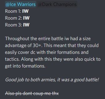 Today we logged on Alaska to have a friendly PB with the Dark Champions! We did amazing, practiced tactics, formations, bombs and room switches! We even went into a room that can only be joined by a command and not maps… the Snow Battleground.
