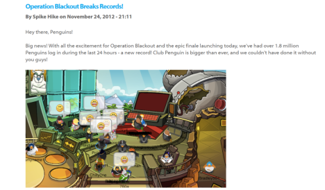 Operation Blackout was released November 14th, 2012, and was meant to last until December 4th, 2012, until it turned out to be the single most successful event in Club Penguin’s history. 1.8 million penguins logged on November 24th, 2012, the largest number of accounts playing at the same time in the entire history of the game, which warranted an addition of 2 more days to the party, having it last until December 6th, 2012.