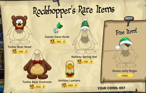 Rockhopper has also returned, bringing new gifts that you can buy from his ships’ catalog! I think the green hats are really cool.