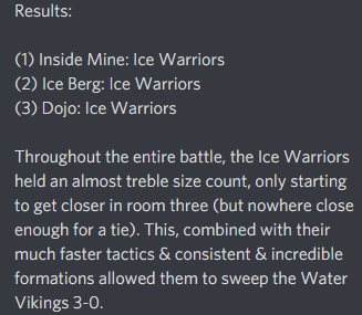 Today we logged on White House for a Color Wars battle against the Water Vikings. Due to our massive size, fast tactics and amazing formations we were able to win by 3-0. Amazing job everyone!