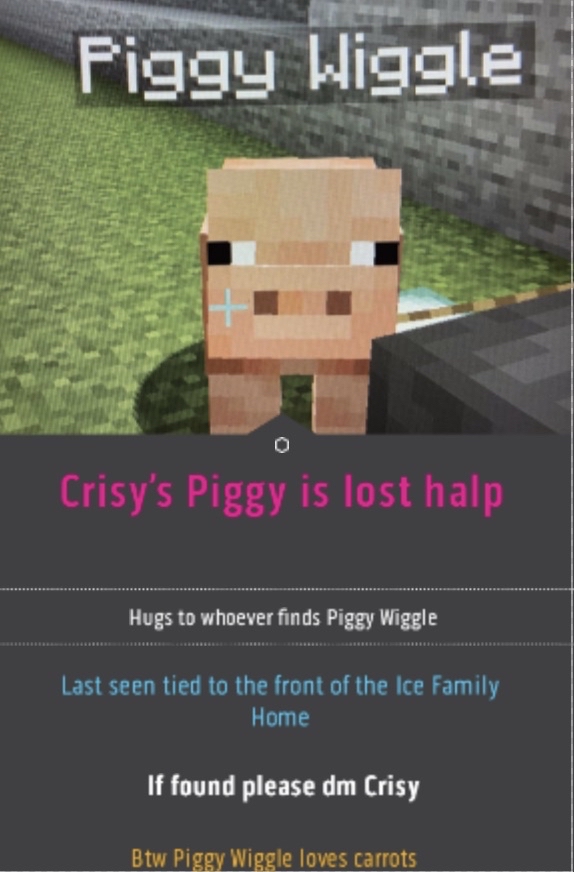 Crisy: Piggy Wiggle was last seen tied to the front of the Ice Family home. However, no one has found my Piggy Wiggle yet.