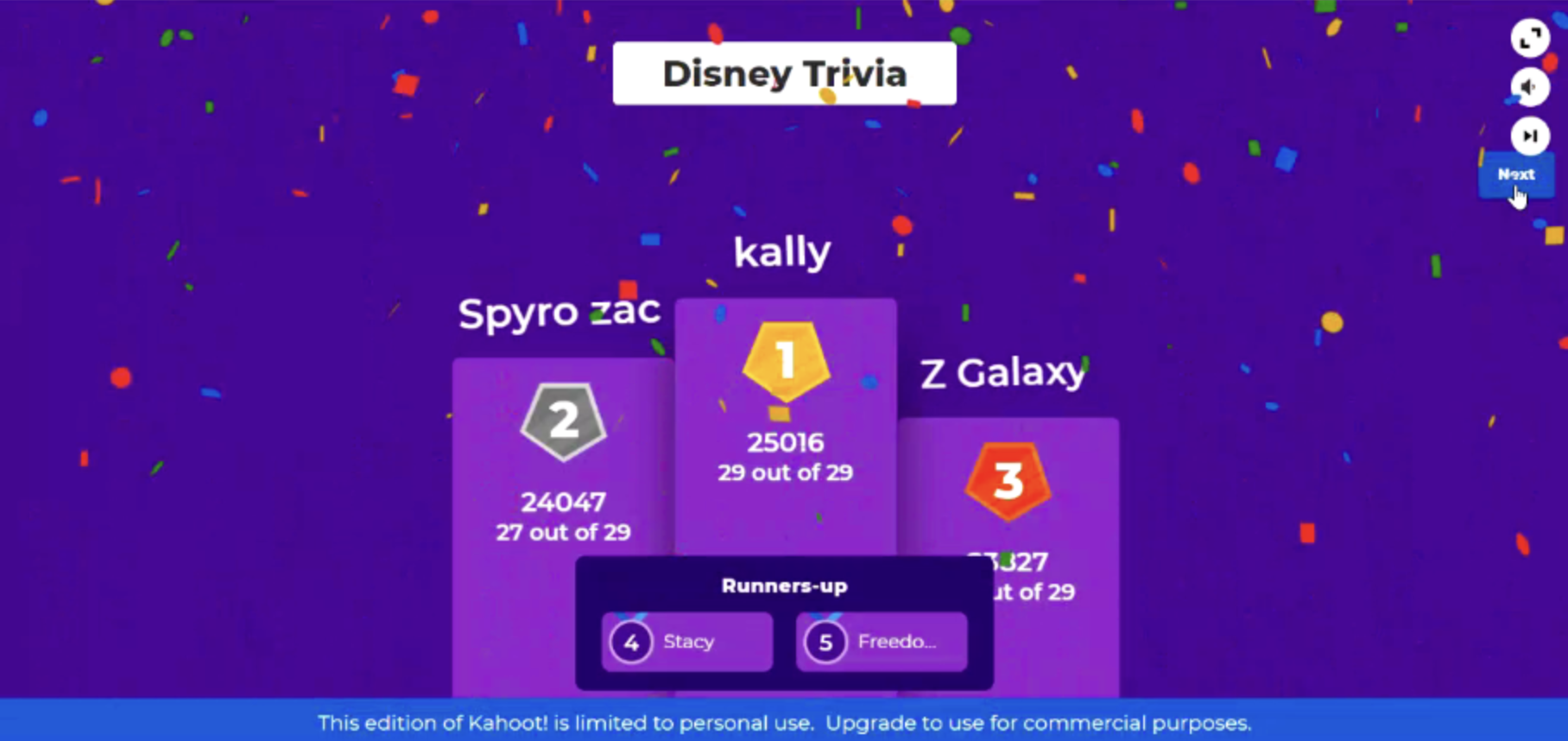 This week, we didn’t have many VC games, but we had 2 movie nights hosted by myself, and we also had a Disney Kahoot, hosted by Owl and a Karaoke Night hosted by Josh! All events had pretty good attendance with 10+, except for movies with an average of 5 viewers!