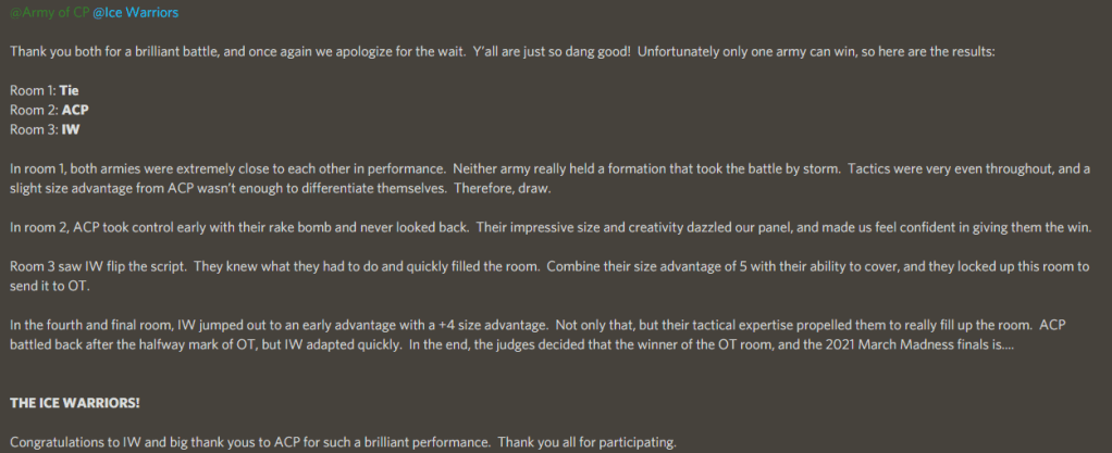After three rooms and an overtime room, we were able to win by 2-1-1! Awesome job all Ice Warriors, we have truly proved to be the superior army once again, let’s keep it going, stay frosty!