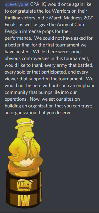 Today we logged on Crystal for one of the biggest battles of the year, winning this tournament for a second consecutive time. Sadly, we didn’t battle our brother allies RPF due to CPAHQ taking the decision of giving the win to ACP (which we don’t agree but ok), so for today we battled the Army of Club Penguin.