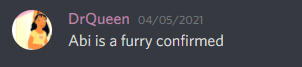 Abi (Furry): Sooo to clarify things, I am NOT a furry, there is nothing wrong with being one but it’s just not my thing. Swirl gave me a pfp with a yellow hoodie girl in the distance and that is where I received the nickname “Big bird” after I began protecting the chickens in fn, our LiT DrQueen, decided she wanted to call me a furry! this furry nickname thing then quickly spread between other staff members and troops