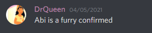 Abi (Furry): Sooo to clarify things, I am NOT a furry, there is nothing wrong with being one but it’s just not my thing. Swirl gave me a pfp with a yellow hoodie girl in the distance and that is where I received the nickname “Big bird” after I began protecting the chickens in fn, our LiT DrQueen, decided she wanted to call me a furry! this furry nickname thing then quickly spread between other staff members and troops