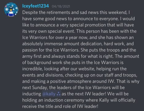 This month of April is still surprising us so far! There have been many events and news that have impacted IW in a way, such as, our recent match against the armies, Help Force, and Water Vikings the Spring Showdown Tournament. That isn’t the best part of the pack, whereas the most exciting and hype-giving moment of the month in April is Kally’s big promotion to Leader! Kally has worked really hard for this moment! Kally has shown great dedication and love for the army and after one year of service, she has received one of the highest IW ranks.