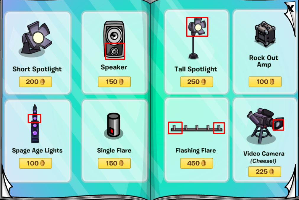 On this second page, you can find lots of different instruments! Some more musical items hidden on this page! You can find a lamp, a footlight stage, a folding chair, a dance mat, a large aquarium, and a pink lamp.