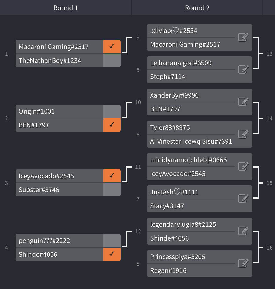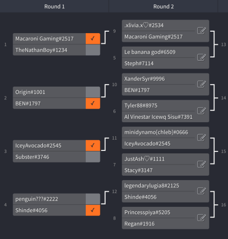 Thank you to everybody who submitted their GFX for Round 1! Without further ado: here is the bracket for round 2!