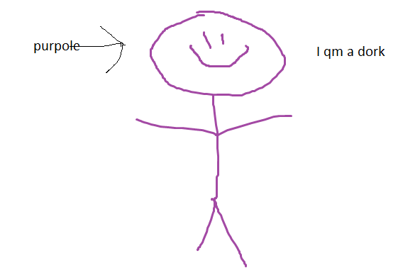 Chevy: This art piece could honestly mean a lot of different things. For me personally, when I see it I see all of the anger and frustration I had at the time. When I was making this, I was very frustrated because Purple kept calling me a dork. I took all of my anger and decided to put it to art, thus making this wonderful canvas that you see. I did not want it to be your everyday piece, so I misspelled a few words to make it… idk… abstract? This canvas took me hours upon hours to make, and I really love the outcome. The squiggly lines, big head, and slight smile give it a personality as well which I loved most about this. So, to answer your question, this art piece is basically calling my dear friend Purple a dork.