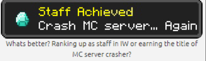 Qt Ben: my favourite thing about the IW MC server is probably the memories. I have countless screenshots of me hanging out with people on the server, and I always enjoy going on the server knowing there will be someone I can chill and hang out with. Another great thing about the server is the events that the staff host. There are multiple games we play, and they are always so much fun :). You should definitely try to attend them