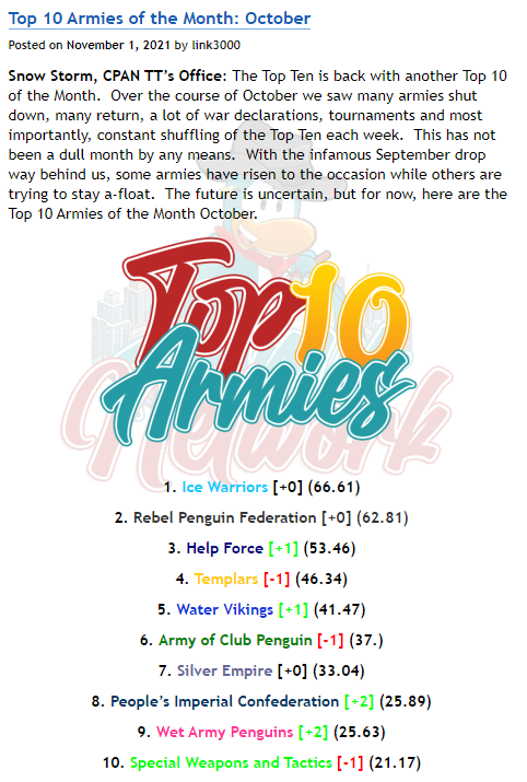 Congrats to Ice Warriors for placing as the #1 Army of October!