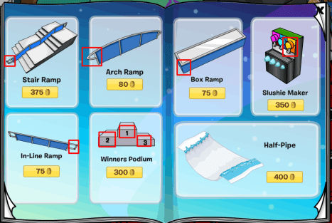 Page 3 you can find an S Curve Ramp, a Princess Throne, a Princess Armoire, Icicle Lights, a Modern Coffee Table and an Ice Rug