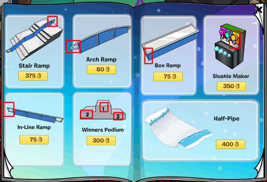 Page 3 you can find an S Curve Ramp, a Princess Throne, a Princess Armoire, Icicle Lights, a Modern Coffee Table and an Ice Rug