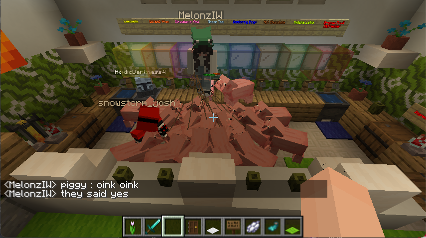 As you may know, Purple, our 2ic, has an extreme obsession with Starbucks. She decided to build one for our new revamped server, a place for players to relax and hang out with friends. One day, Melonz and Purple logged onto the server to work on the update, but not much progress was made. Melonz decided to spawn hundreds of pigs and bring them on a class field trip to the newly opened Starbucks. The pigs ordered 1000 caramel Frappuccinos, 40 banana breads, and 10 strawberry acai. You may be wondering why these pigs ordered so much food. Well, our Ice Warriors piggy, Melonz, decided she wanted to sacrifice the piggys, so it was only natural to fatten them up prior to sacrifice.