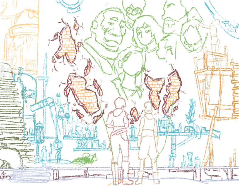 To summarize this picture from my perspective, this looks like 2 people looking at a mural (a painting drawn on a wall) in what seems to be outside or a giant room with various items on shelves, books stacked up on top of each other creating a “mountain”. A very creative drawing!