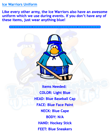 Filed under: Club Penguin, CLUB PENGUIN ICY FIGHTERS, CP, CPCheats, Ice Guardians, Ice Ninjas, Ice Warriors CP, ice warriors of cp | Tagged: blue, catalog, catalogue, Ice Warriors, IW, uniform |