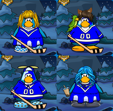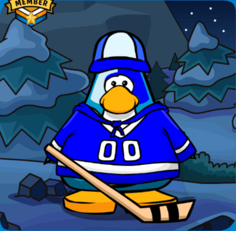 The official guide shows the penguin wearing blue shorts, which are unavailable in the game. Thus, the current official body item is the Blue Hockey Jersey, with the Hockey Stick as the official hand item, that is also featured on the website. The two items can be found in the Stadium Sports Catalogue.