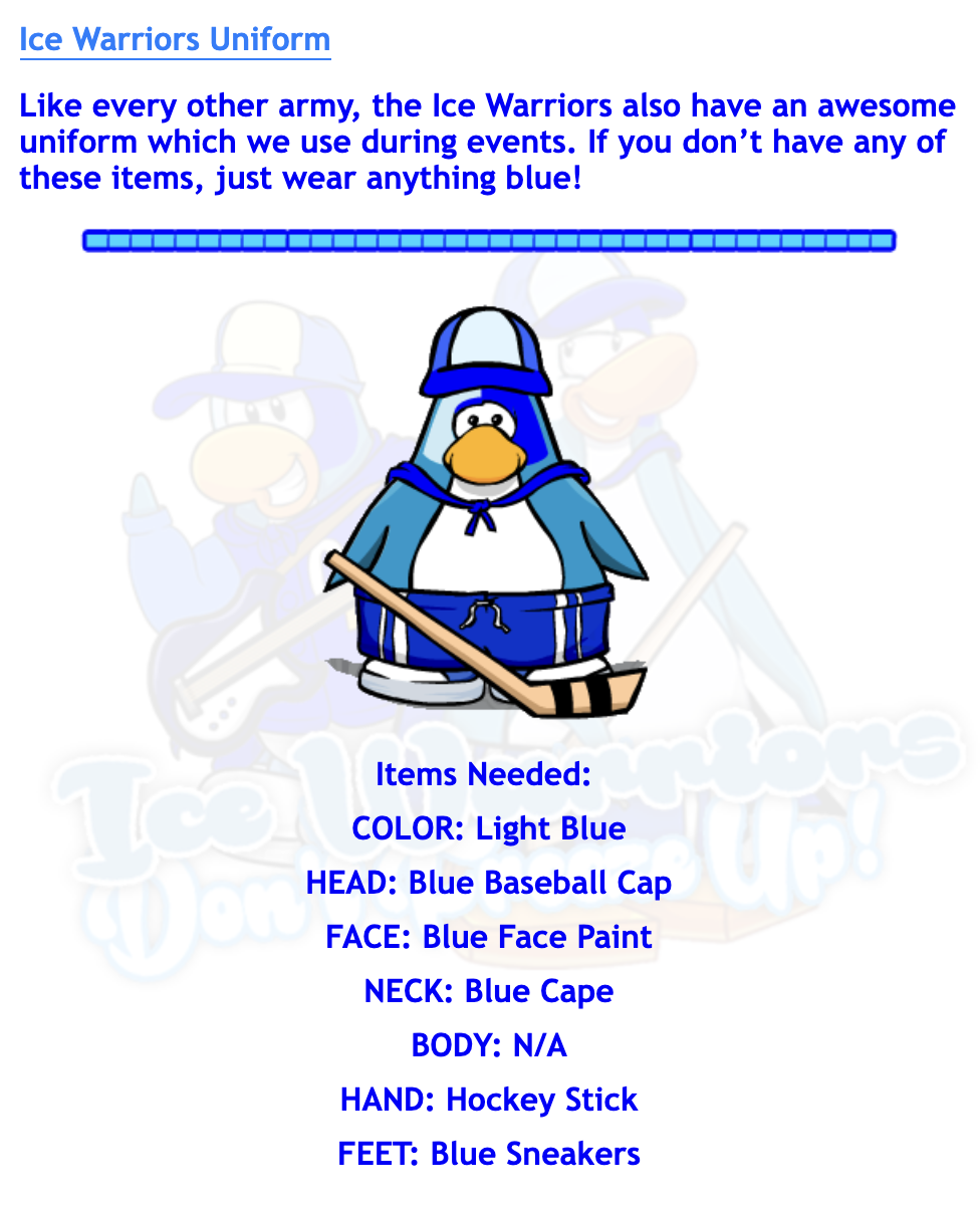 Filed under: Club Penguin, CLUB PENGUIN ICY FIGHTERS, CP, CPCheats, Ice Guardians, Ice Ninjas, Ice Warriors CP, ice warriors of cp | Tagged: blue, catalog, catalogue, Ice Warriors, IW, uniform |