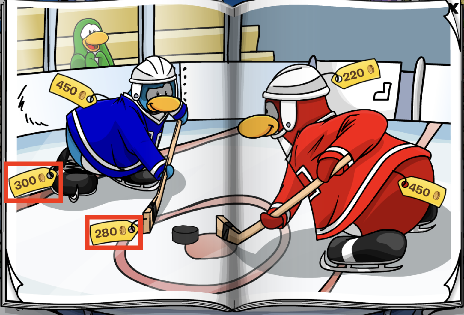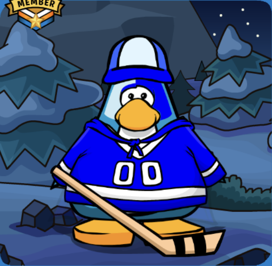 The official guide shows the penguin wearing blue shorts, which are unavailable in the game. Thus, the current official body item is the Blue Hockey Jersey, with the Hockey Stick as the official hand item, that is also featured on the website. The two items can be found in the Stadium Sports Catalogue.