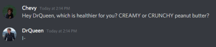Hey DrQueen, which is healthier for you? CREAMY or CRUNCHY peanut butter? She was not pleased with my question BUT I got an answer nonetheless.