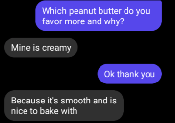 For our next question, I will be asking multiple people their opinion instead of one because DrQueen is obviously biased against me. So, I asked 10 people (Melonz, Purple, Queen Anna, Sirgon, Mysterious, Icy, Chezy, omer, Subster, and Suation) “Do you like CREAMY or CRUNCHY peanut butter more?” The results are below: