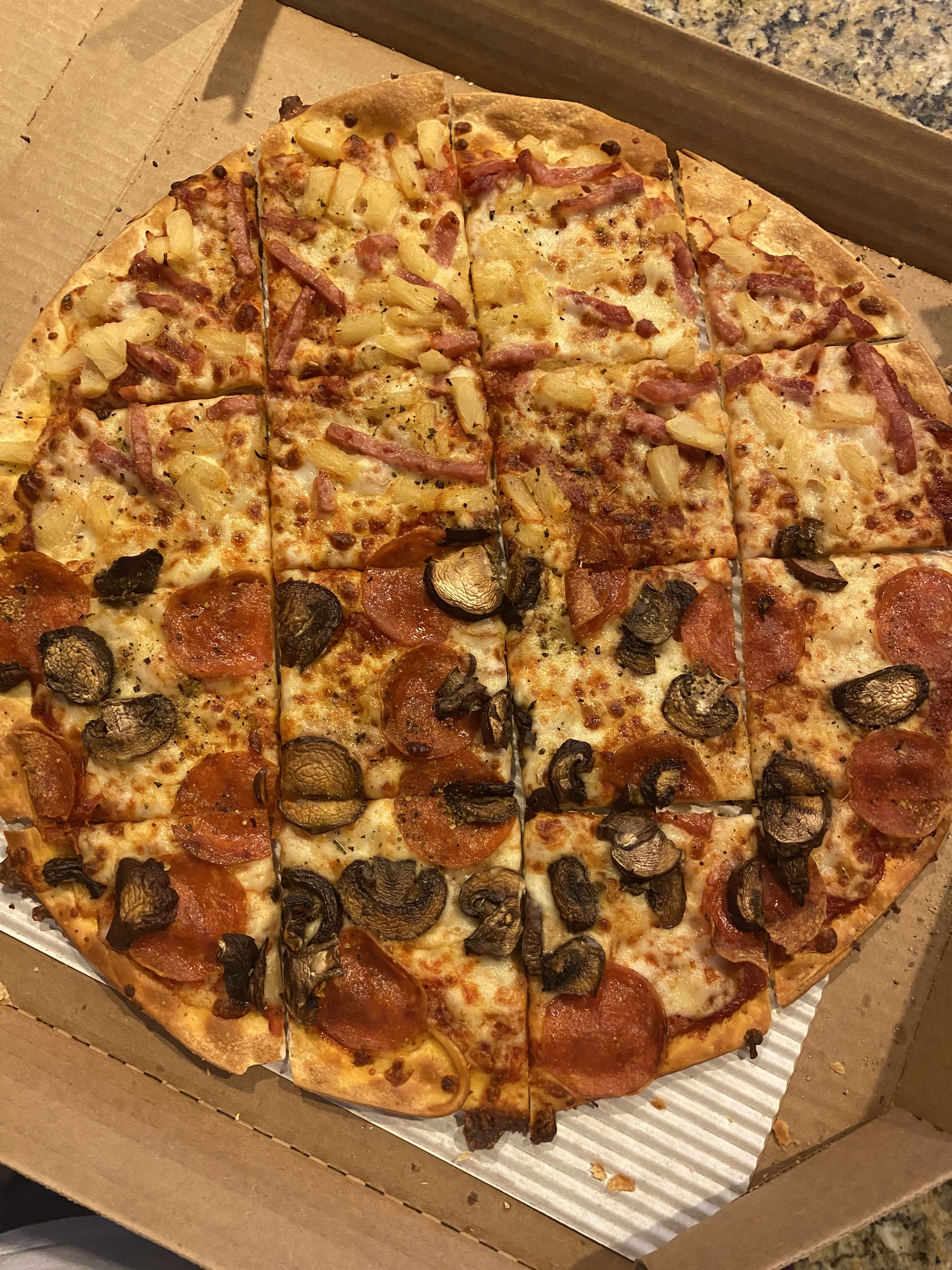 Josh: I can mainly talk about the toppings on it which are definitely some of my favorites for a pizza. Pepperoni and mushroom for one half is really nice, but the Hawaiian side is also pretty good.