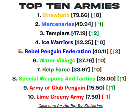 So in response to yall broken hearts, you knew you had no chance against TCP, Strawhats declared Ice Warriors, Rebel Penguin Federation, Water Vikings, Help Force, SWAT, Army of Club Pengiun, Lime Green Army, Takis, and Among Us Army.