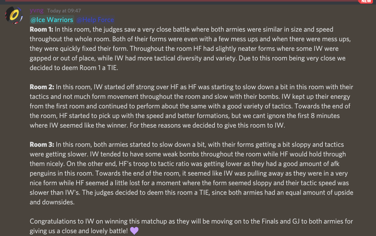 Purple: Purple wanted a whole separate post for her message. So you can find it here. Ride or Die. Wifey 4 life. Sister. Best Friend. Not going to lie, every time I talked retirement with you, I knew in my head I wanted to retire but sometimes I would chicken out. I always thought it was gonna be me who was the last one to retire, but now you get to slave for Icequeen and Levels some more HAHAHAHAH. I still remember the day meeting you in IW main chat and you were just a fresh-off-the-boat staff:*) and I was a baby SIT. Every night coming home from school, I would look forward to hoping on discord and just talking and fangirling about different things. Then who knew our FRIENDSHIP WOULD SKYROCKET to what it is today. We seriously LOL, my god we been THRU IT ALL. You were always the first to know everything going on in my life, always the first person I went to if I needed to cry, rant, scream or just want to annoy and you were always there for me. The friendship we have together is something I cherish every day, and no matter what, I protect you from all the penguin boys trynna snatch you (I don’t blame them cause you are really hot). Thanks for being an integral part of the army journey in IW and Water Ninjas. You are a blessing in my life and deserve all the happiness in the world and I wish you nothing but the best. Can’t wait to see my babes graduate, and me and Aaron are always rooting for you! (I love you more) To the many more years of our amazing love and friendship together, thank you purple, seriously. I don’t tell you this enough or sometimes I don’t show my appreciation for you enough, but you are always my girl for life ❤ Kith kith: https://www.youtube.com/watch?v=TUVcZfQe-Kw
