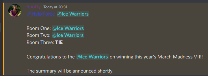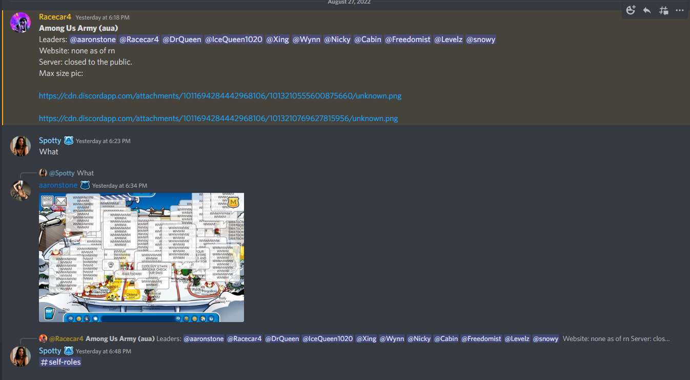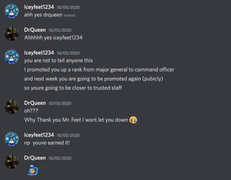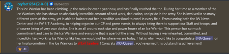 Panini and Quinn were the first two individuals who welcomed me into IW. In fact, Panini was the reason I stayed in Ice Warriors because she made me feel really welcome. Then I met IceQueen1020, my first friend in Ice Warriors, and we found out we had too much in common, and we called ourselves sisters, a man who would have thought I was gonna lead an army with this one brain cell person one day. I had fun in IW and met some fantastic people, especially Lemonade1Steph, Purplelady05, Clindsz, Chris183, Shinde, Waddle, and Josh. We hung out so much in VC’s recruiting and welcoming. Staff didn’t feel like a job, but instead felt like an escape from the real world, which I needed, given my program was starting a bit wonky. Staff was definitely fun; I didn’t care for promos until one day, I looked on the site and got Major General (7ic), then eventually SKIPPED a whole ass rank. Thank you, Iceyfeet1234, for letting me skip a staff rank, but you made Levelz do all the ranks :)))))))) (WHO THE BITCH NOW, LEVELZ?!??!?)