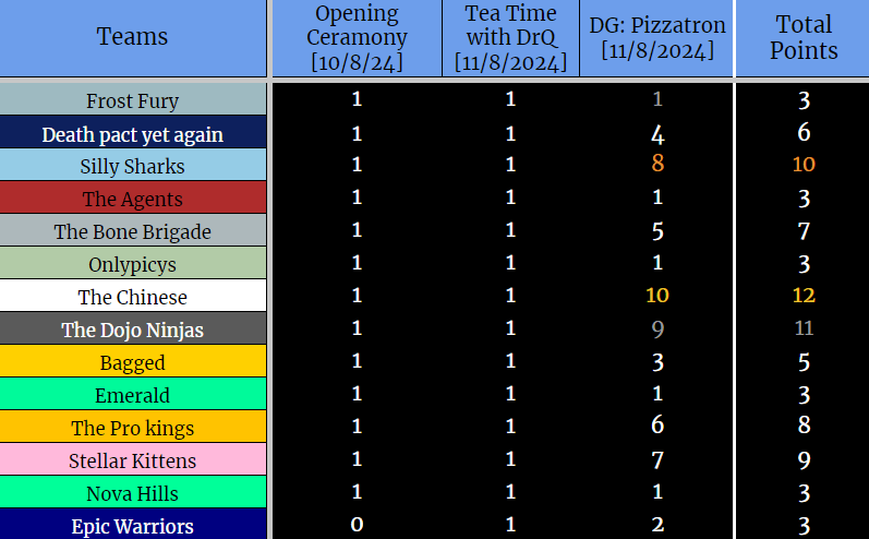 π€Teams shown: Frostfury, Death Pact Yet Again, Silly Sharks, The Agents, The Bone Brigade, Onlypicys, The Chinese, The Dojo Ninjas, Bagged, EMeRaLD, The Pro Kings, Stellar Kittens, and Nova Hills!π€